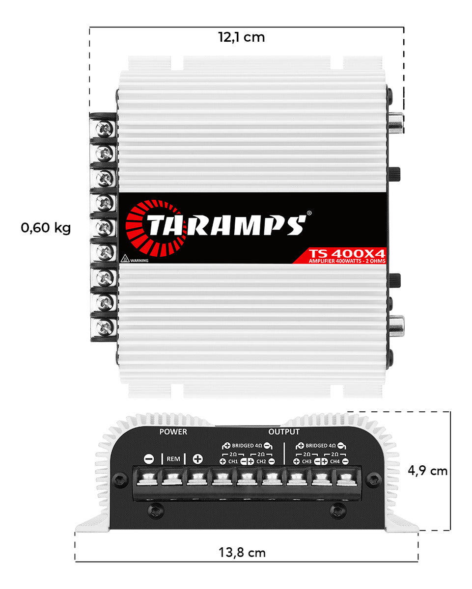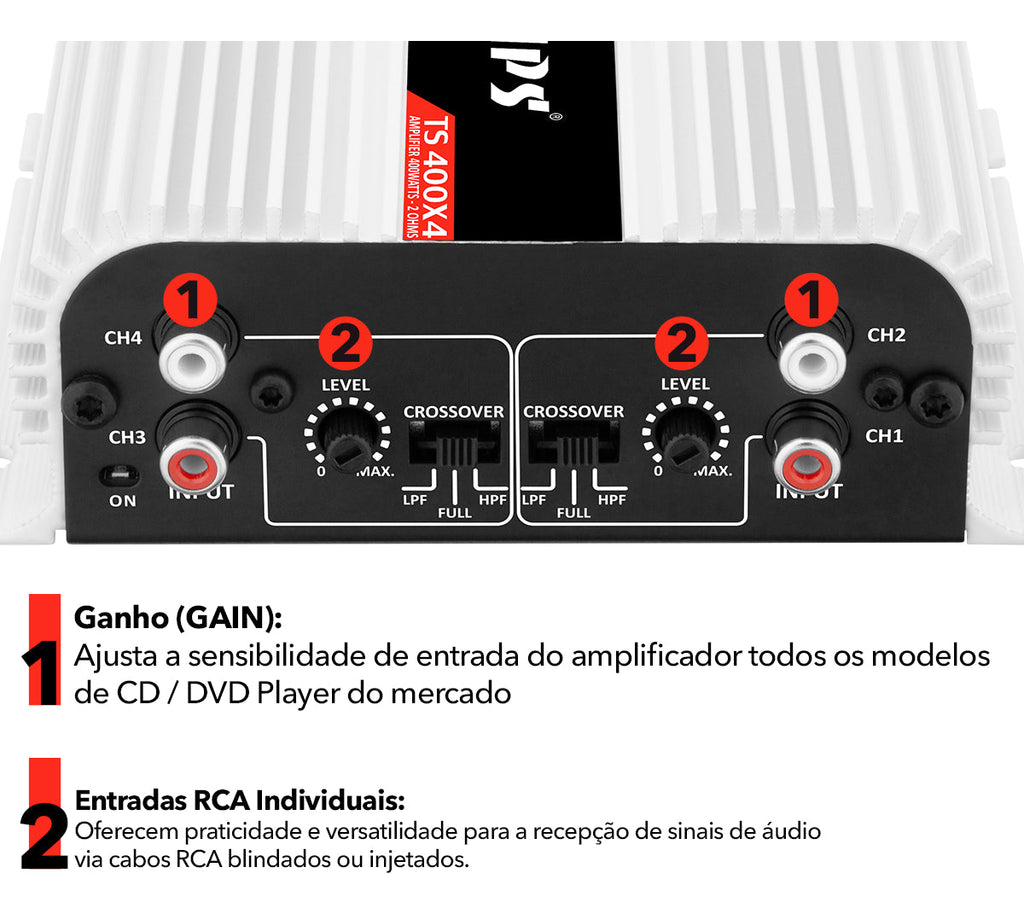 O TS 400X4 é full range, podendo ser utilizado com os mais variados modelos de alto-falantes, subwoofer, corneta, tweeter, médio, woofer, médio grave e super tweeters. Possui crossover integrado (hpf, lpf, full) que configura o modo de operação do amplificador. Ajuste de ganho que permite o ajuste aos níveis de sinal de saída de praticamente todos os modelos de cd/dvd players do mercado. Led indicativo, que mostra que o amplificador está ligado.